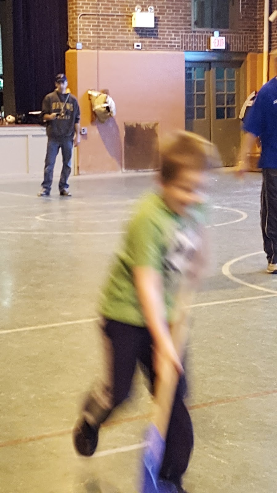 Speaking of a blur, just look at Alan go. One of the fun things we got to do in Boston was to watch Alan play floor hockey. Boy do these guys move!! They play in a school gym and have a great time. We had to watch our toes if the puck came our way.